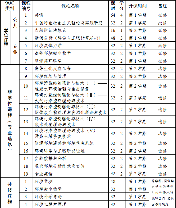 (四)基本能力培养目标:具备获取知识能力,包括良好的信息查询能力、学术交流能力和自学能力等;对环境领域研究方法、研究过程,以及研究成果的科学性和价值具有判断能力;具有良好的科学研究能力,能够运用科学方法客观地分析问题、解决工程实践问题的能力;具备外语能力和计算机技能等。