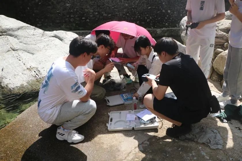 实践团师生们分别去到上林下水源景区、霞客古渡景区和大龙湖景区等三个景区进行水样采集。现场使用快速检测仪测定对采集水样的溶氧量、浊度、PH等多个维度进行水质初步评估。