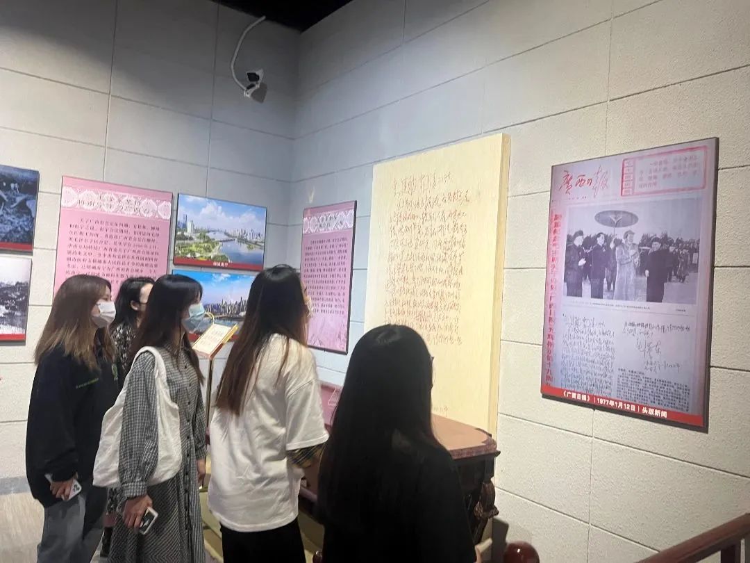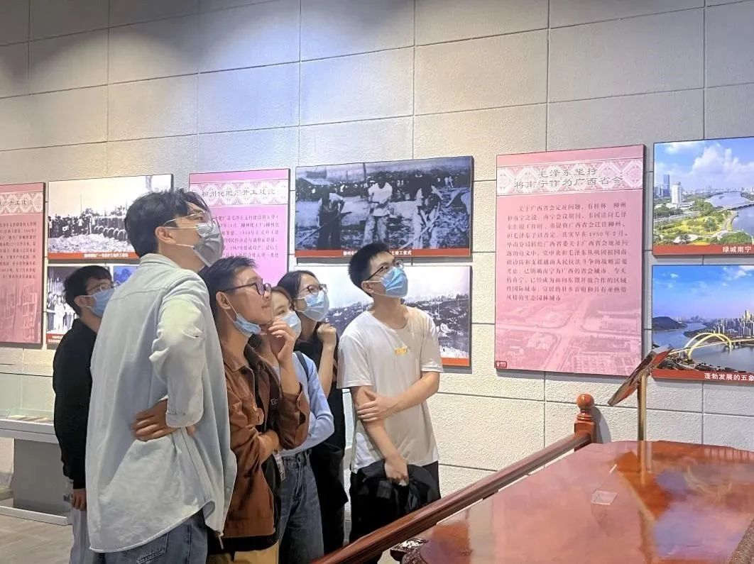 接着,学生党员们参观了毛主席接见广西各族人民纪念馆。纪念馆由序厅、走近南宁群众、南宁会议、关怀壮乡建设四个部分组成,展示了毛泽东、刘少奇、周恩来等国家领导人指导广西地区社会主义现代化建设的历程。通过参观学习,学生党员们纷纷表示,要加强对四史的学习,增强“四个意识”、坚定“四个自信”、做到“两个维护”,踔厉奋发、勇毅前行,为国家现代化建设添砖加瓦。