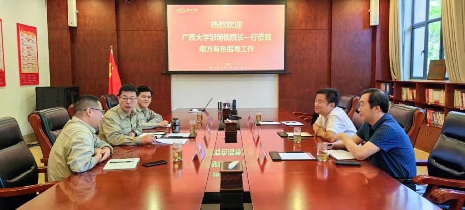 在与南国铜业调研交流时,邹炳锁介绍了学科专业发展、平台建设、科学研究和人才队伍建设的基本情况。重点就加强院企合作的需求和致力于建设有色金属领域广西高水平实验室进行了交流。他表示,依托广西大学建设高水平实验室有人才资源和科研优势,同时学校也在积极围绕企业需求,聚焦行业技术瓶颈,与相关领域企业建立长期合作共建机制,共同推动产业升级。近年来学院在科技合作、新材料、新能源等领域取得了一系列突破性成果,部分技术已成功实现产业化应用,为企业创造了显著的经济效益,为组建高水平实验室奠定了坚实基础,希望与更多的行业企业深化院企合作与共建。