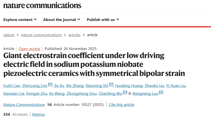 近日,我院科研团队研发出具备超低驱动电场和巨应变系数的铌酸钾钠无铅压电材料,性能超越当前主流的铅基压电体系,在高精度微型器件应用领域上展现出巨大的潜力。该成果以 “Giant electrostrain coefficient under low driving electric field in sodium potassium niobate piezoelectric ceramics with symmetrical bipolar strain”为题,发表在国际知名期刊《自然·通讯》(Nature Communications, 2025, 16, 10527.)上。广西大学为第一单位,beats365(中国区)-唯一官方网站已毕业硕士研究生曹富植(目前为西北工业大学博士研究生)和岑侦勇副教授为共同一作。值得注意的是,这是我校硕士研究生首次以第一作者在Nature Communications发表论文。我校罗能能教授、岑侦勇副教授,北京科技大学施小明博士,浙江清华长三角研究院吴超峰博士为论文的共同通讯作者。清华大学王轲教授、徐泽博士,北京理工大学黄厚兵教授等人为论文提供了重要支持。
