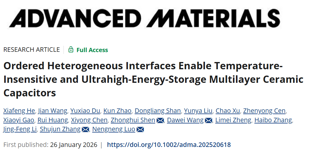 近日,我院罗能能教授团队在电介质陶瓷材料领域实现重要突破,成功开发出兼具高储能密度和高温度稳定性的复合电介质陶瓷,并研制出多层陶瓷电容器(MLCCs)。相关研究成果于2026年1月26日以《Ordered Heterogeneous Interfaces Enable Temperature-Insensitive and Ultrahigh-Energy-Storage Multilayer Ceramic Capacitors》为题发表在《Advanced Materials》上 (https://doi-org-s.vpn.gxu.edu.cn:8118/10.1002/adma.202520618)。我院博士研究生何霞凤为第一作者,罗能能教授为论文通讯作者,武汉理工大学沈忠慧教授、哈尔滨工业大学王大伟教授和香港城市大学张树君教授为共同通讯作者。合作单位还包括山东大学,湘潭大学,香港理工大学,华中科技大学以及清华大学。