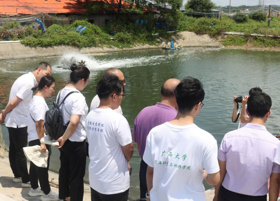 在广西港河生态农业有限公司,实践团队参观特色生态农业项目,了解到该公司坚持自主创新,已经与多个环保科研机构开展合作,成功研发出对虾生态化循环水养殖模式,率先在国内实现“清水养虾”“高频次收虾”“循环水养虾”。