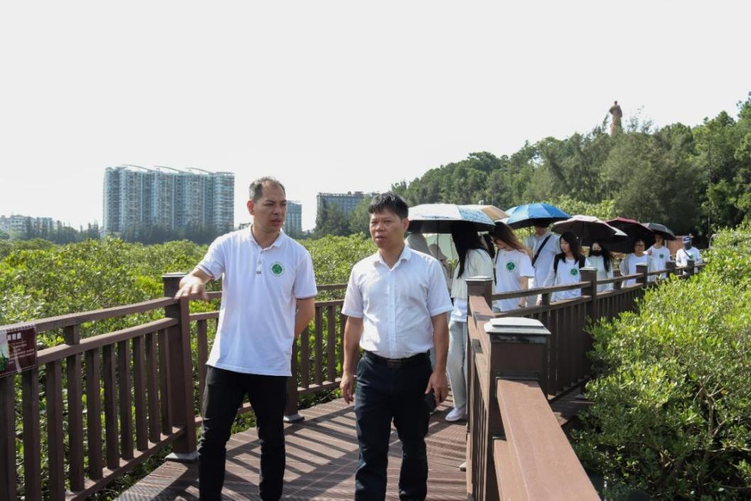 在钦州市港仙岛公园,实践团队现场参观红树林生态保护区。在园区工作人员的带领下,团队成员近距离观察红树林的生长环境,了解其生态功能与养护注意事项。