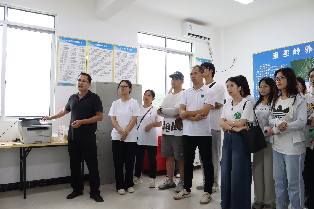 此外,实践团队前往位于康熙岭镇的渔光一体养殖尾水处理试点项目进行参观。通过实地参观走访,团队成员了解到该项目依据水域生态学原理,采用智能生物链治理技术,通过构建生态高效集约化的处理系统实现养殖尾水的达标排放,对生态治理技术和废水处理的相关工艺流程有了更深入的了解。