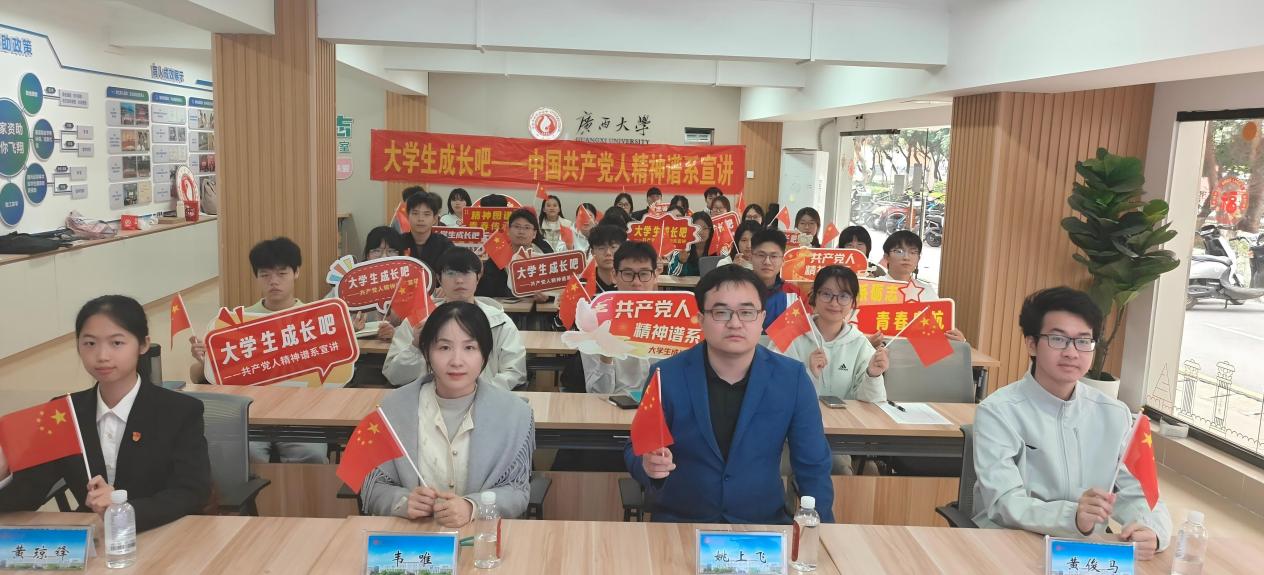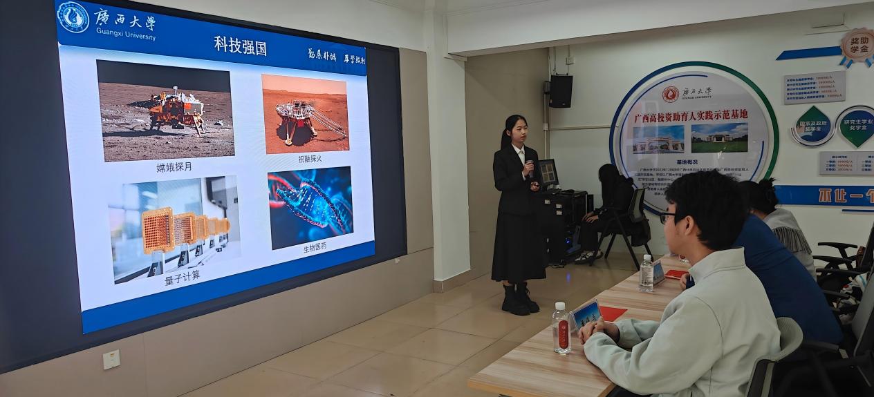 为深入学习中国共产党人精神谱系,弘扬科学家精神,12月30日,我校在西21栋学生一站式社区开展“大学生成长吧——中国共产党人精神谱系宣讲”系列活动,一起领略知名科学家的风采,探寻科学家精神的丰富内涵,汲取其支撑科技强国的磅礴力量。广西大学学生工作部(处)韦唯老师、我院专职辅导员姚上飞老师与2023级本科生黄俊马、2024级本科生黄琼锋为学校50余名师生作主题宣讲。