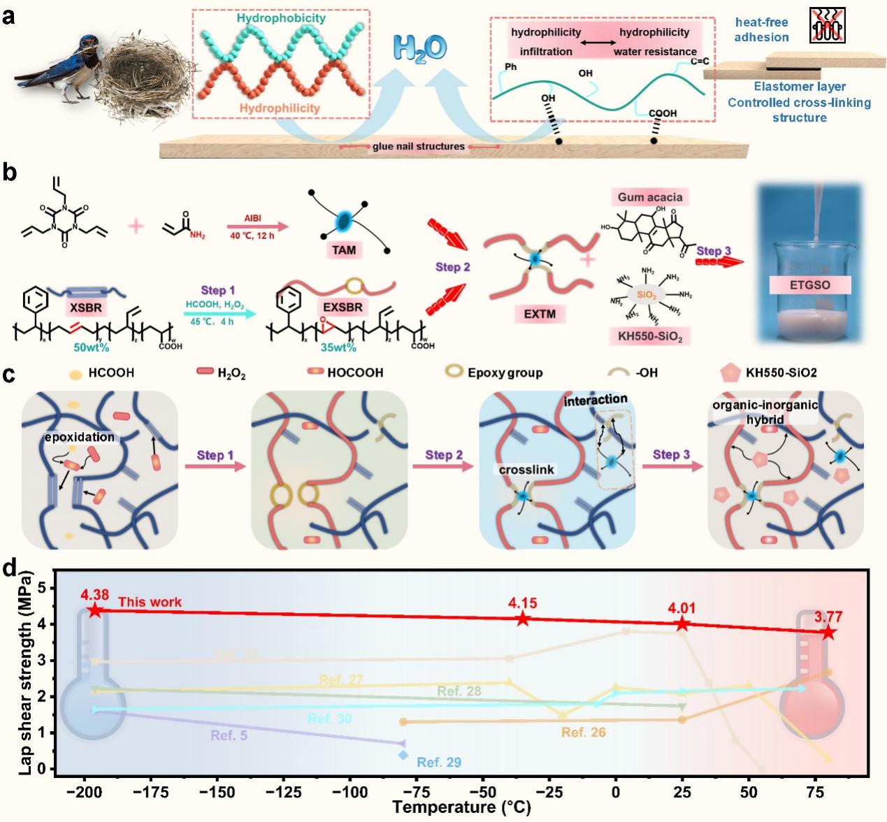 本研究灵感来源于鸟巢蛋白的交联机制,通过对羧基化苯乙烯-丁二烯乳胶进行原位环氧化改性,将非极性双键转化为高度反应性的环氧基团。结合多氨基预聚物、改性二氧化硅和环氧改性乳液,构建出了一种双物理-化学交联系统,成功开发出一种新型冷压胶粘剂。