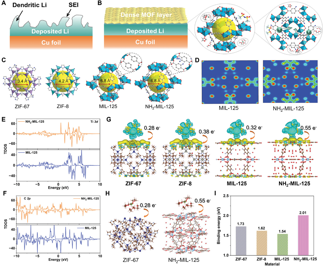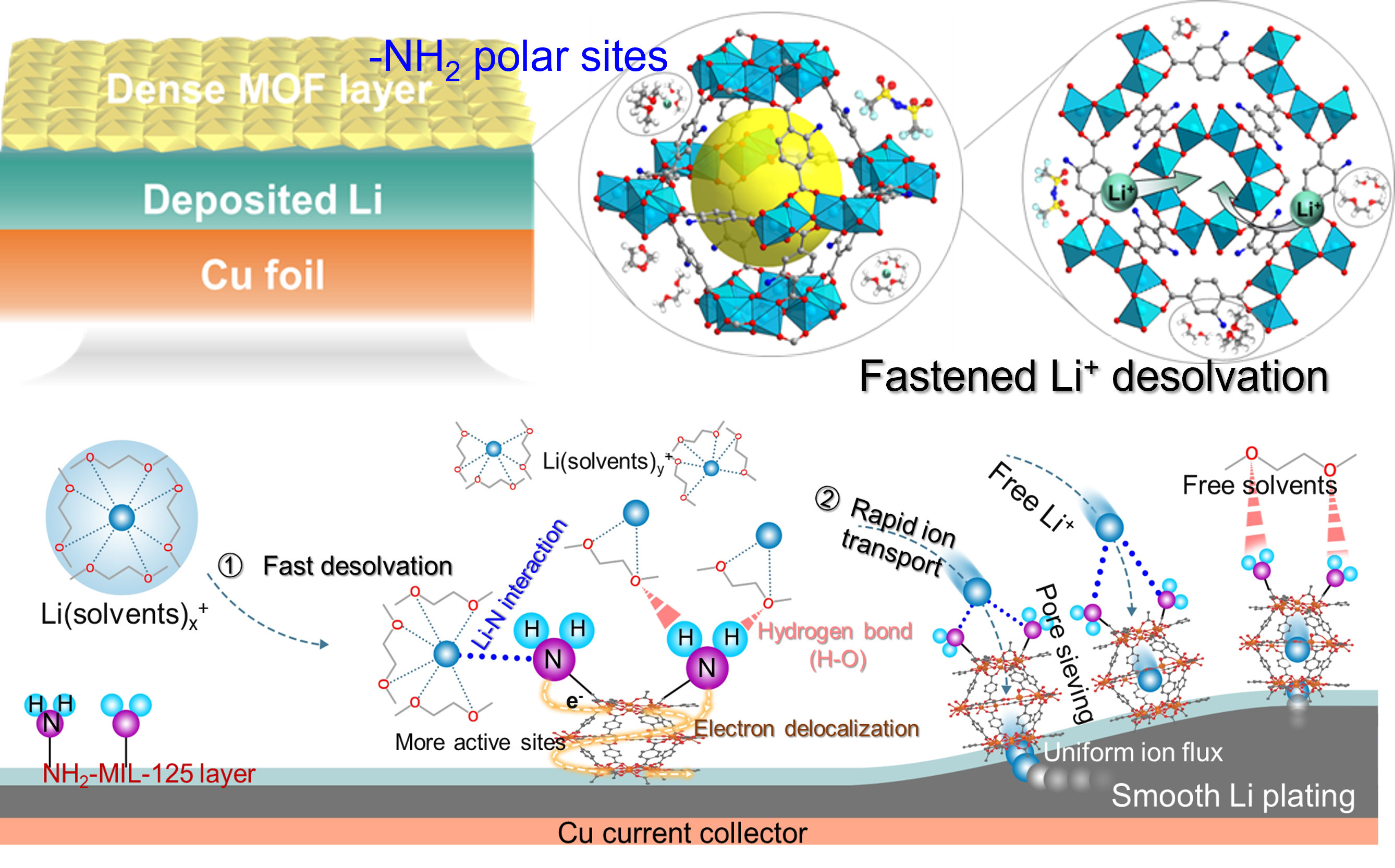 不同于常用的电解液工程策略,我院刘美男教授与德国赫姆霍兹研究所王健博士等人合作共同提出了新型的界面协同主动脱溶剂概念;通过设计并引入电子离域型极性基团修饰的多孔金属-有机框架(MOF),该极性电子给体型化学基团显著调节锂离子去溶剂化/扩散行为,展示了高效的锂离子脱溶剂过程;进而极大提升了锂离子界面输运动力学,有效缓解了低温下金属锂枝晶的生长等问题,助力金属锂电池的低温应用。即使在高负载或低温环境下,所制备的Li-NCM811全电池,在-20℃的温度下,依旧可以保持130次循环且容量保持率高达97%,为低温锂金属电池的实际应用提供可能。