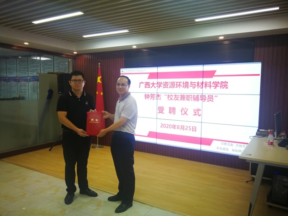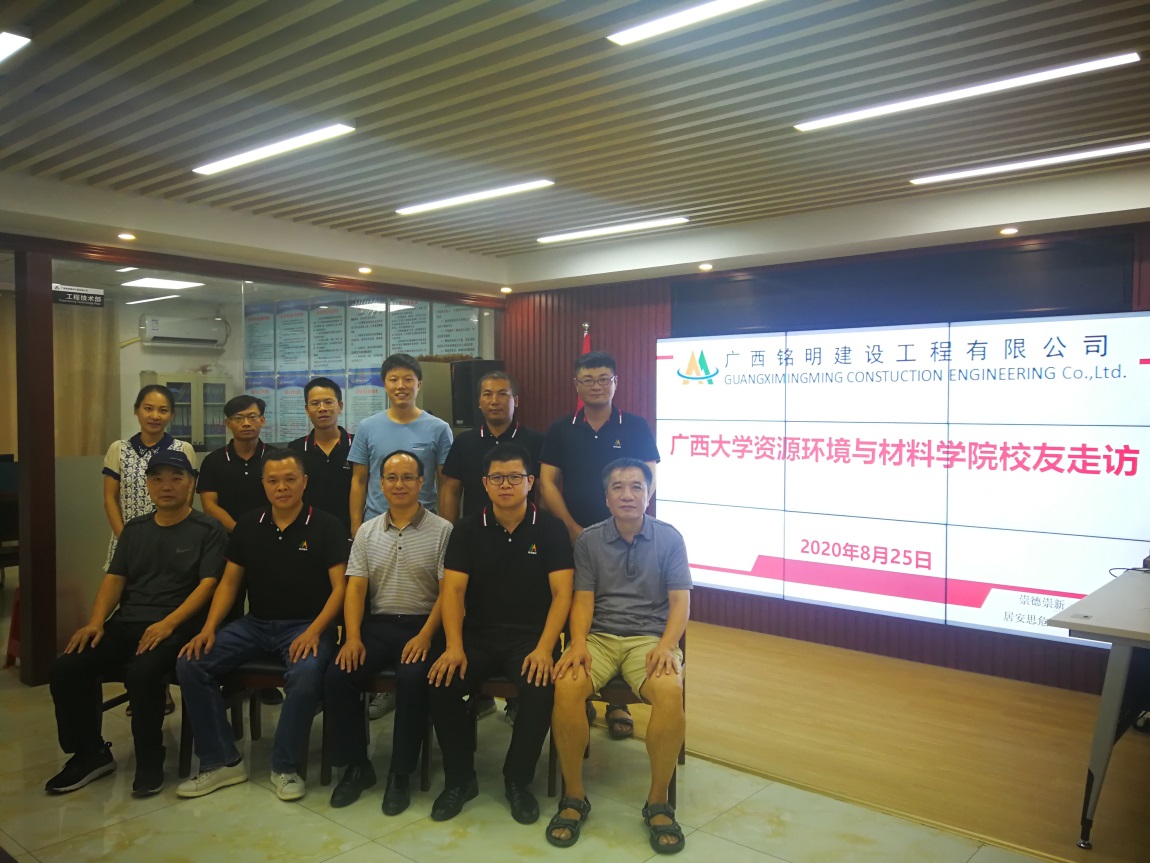2020年8月25日,beats365(中国区)-唯一官方网站党委沈大强书记带队,吴达慧副书记、吴仲雄教授、谭海文副教授、王纪坤老师前往南宁市武鸣区,到校友企业—广西铭明建设工程有限公司考察调研,同时为我院“校友兼职辅导员”该公司董事长钟芳杰颁发聘书。