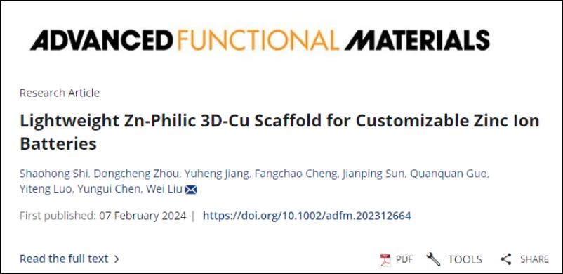 近期,我院石绍宏老师在3D打印水系锌离子电池研究领域取得重要进展,研究成果以“Lightweight Zn-philic 3D-Cu Scaffold for Customizable Zinc Ion Batteries”为题,发表在SCI杂志《Advanced Functional Materials》(中科院1区,IF =19.0)上。论文第一作者为我院石绍宏助理教授,学生第一作者为周东成硕士研究生,通讯作者为四川大学刘慰研究员,广西大学为第一完成单位。该研究工作得到国家重点研发计划(2022YFE0135900)、国家自然科学基金项目(52303036)、广西科技基地和人才专项项目(GUIKE AD23026179)等项目支持。近年来,结合3D打印增材制造技术,该团队已在Nano-Micro Lett.、Chem. Eng. J.、Compos. Part B Eng.、Carbohyd. Polym.等发表高水平SCI论文多篇。