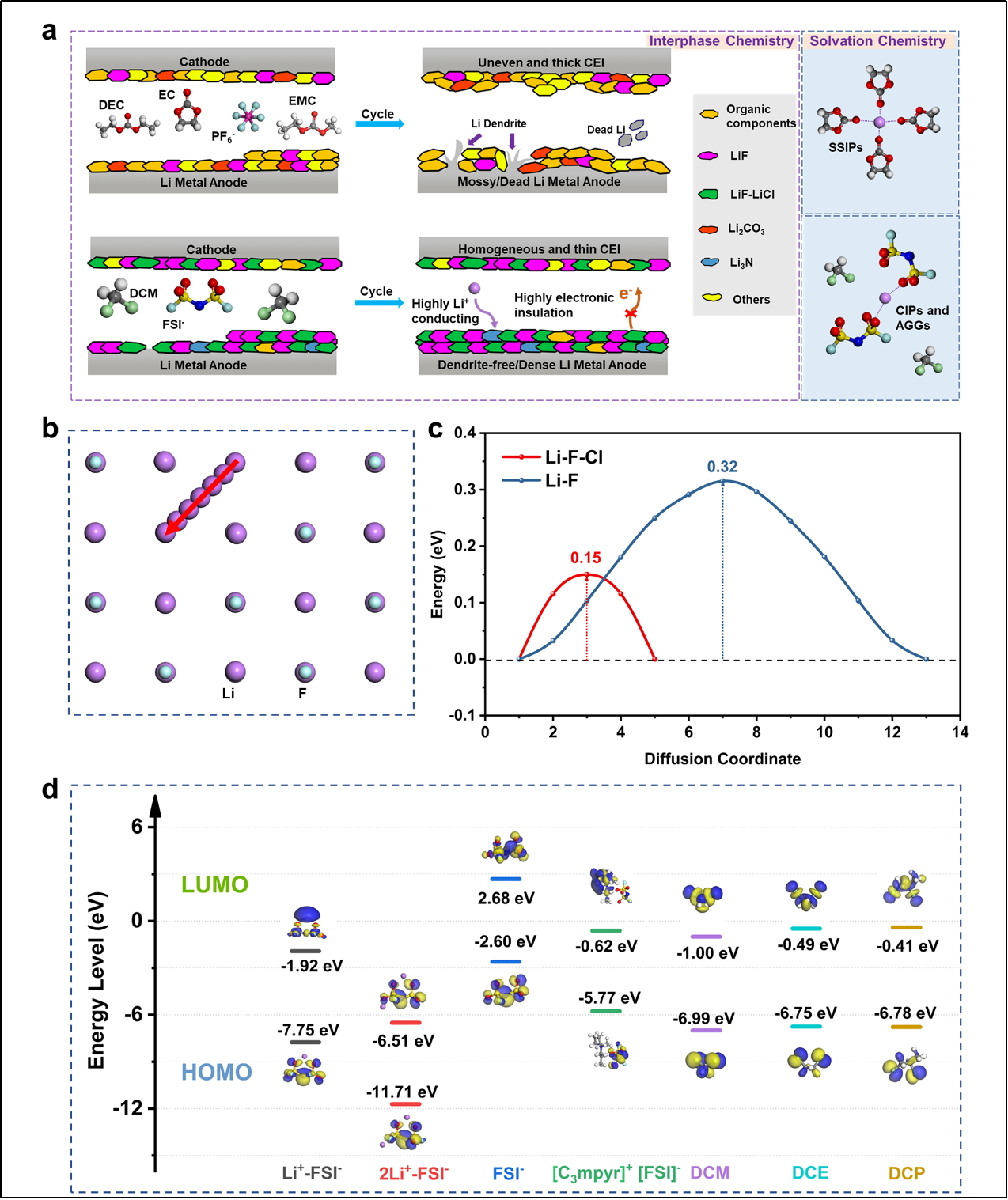 锂金属电池商用化,受限于不可控的副反应以及锂枝晶生长,通过建立富含LiF的SEI能有效提升锂离子扩散动力学,延长锂金属电池寿命。优秀的锂离子扩散动力学能够使锂电池在恶劣环境下能具备卓越的性能,但是扩散过程包含着复杂的液相、间相和固相传输,这使得改善锂离子扩散动力学变得富有挑战性。另一方面,LiF本身较低的离子电导率也阻碍了锂离子的快速传输。针对这一挑战,能源材料与器件团队刘美男教授通过引入氯元素形成具备更高电导率、更低扩散能垒的电解质电极界面(EEI)。通过比较不同含氯稀释剂的LUMO/HOMO,确定二氯甲烷DCM为最合适的稀释剂。阐明了这种稀释剂通过对体系溶剂化结构进行调控,来诱导形成更低的锂离子扩散能垒的双卤化EEI,进而抑制锂枝晶的生长。