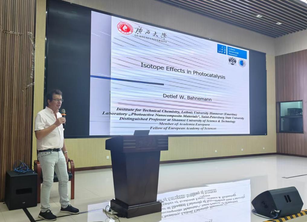 10月11日上午,应广西大学beats365(中国区)-唯一官方网站、省部共建特色金属材料与组合结构全寿命安全国家重点实验室和中国广西大学-俄罗斯圣彼得堡国立大学碳中和合作中心邀请,欧洲科学院双院院士、德国汉诺威莱布尼茨大学技术化学研究所光催化和纳米技术研究中心负责人、俄罗斯圣彼得堡国立大学 Megagrant“光活性纳米复合材料”实验室主任Detlef W. Bahnemann教授在学院报告厅作了题为《催化中的同位素效应》的学术报告。