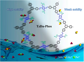 本团队设计合成了具有六边形孔道的COF骨架TzDa,通过后合成修饰的方法得到磷酸功能化的TzDa-Phos,用于水溶液中的锕系金属离子的高选择性去除,并通过FT-IR、XPS和EXAFS详细解释了随酸度变化相互作用机理的变化。在近中性条件下,主要是P-O-参与U(VI)的配位;随着酸度的升高,P-O-完全质子化,在高酸度下,TzDa-Phos对U(VI)和Pu(IV)的吸附能力主要是由于磷酸功能化基团中的P=O。这项工作证明了COF材料在处理放射性废水方面的应用潜力,并有助于通过具有确定拓扑结构和化学成分的COF基材料来了解影响固相萃取行为的关键因素。