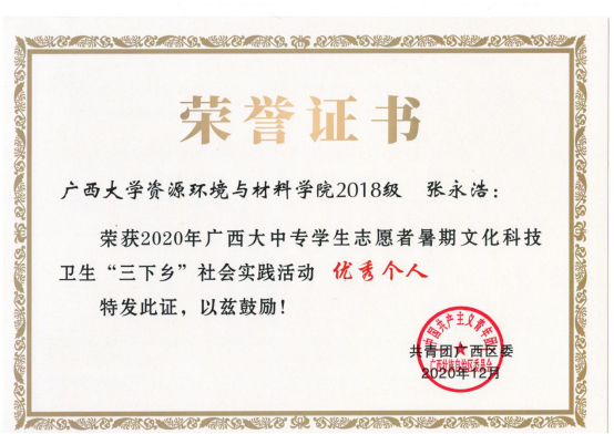 近日,据共青团广西壮族自治区委员会《关于2020年广西大中专学生志愿者暑期文化科技卫生“三下乡”社会实践活动的通报》,我院环工182班张永浩同学荣获2020年广西大中专学生志愿者暑期文化科技卫生“三下乡”社会实践活动优秀个人,环工182班张永浩、谭展龙、雷杰如同学的《关于刘家沟村精准扶贫的调查研究》报告荣获2020年广西大中专学生志愿者暑期文化科技卫生“三下乡”社会实践活动优秀调研报告三等奖。他们利用2020年暑期对山东省日照市刘家沟村当地的精准扶贫工作进行了深入调研,结合实际情况与学所知识,撰写出了高质量的调研报告,为当地扶贫工作出谋献策。